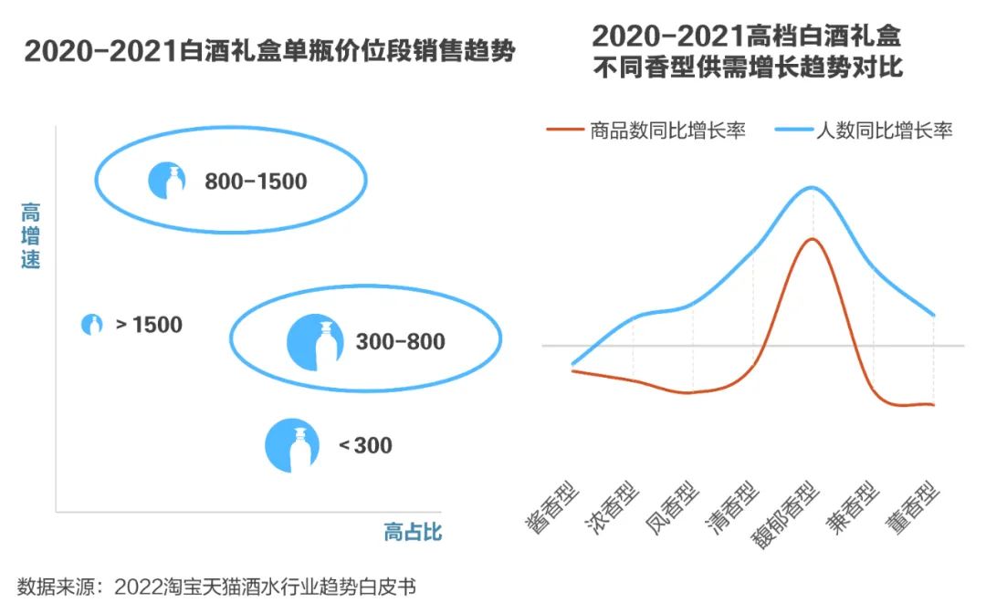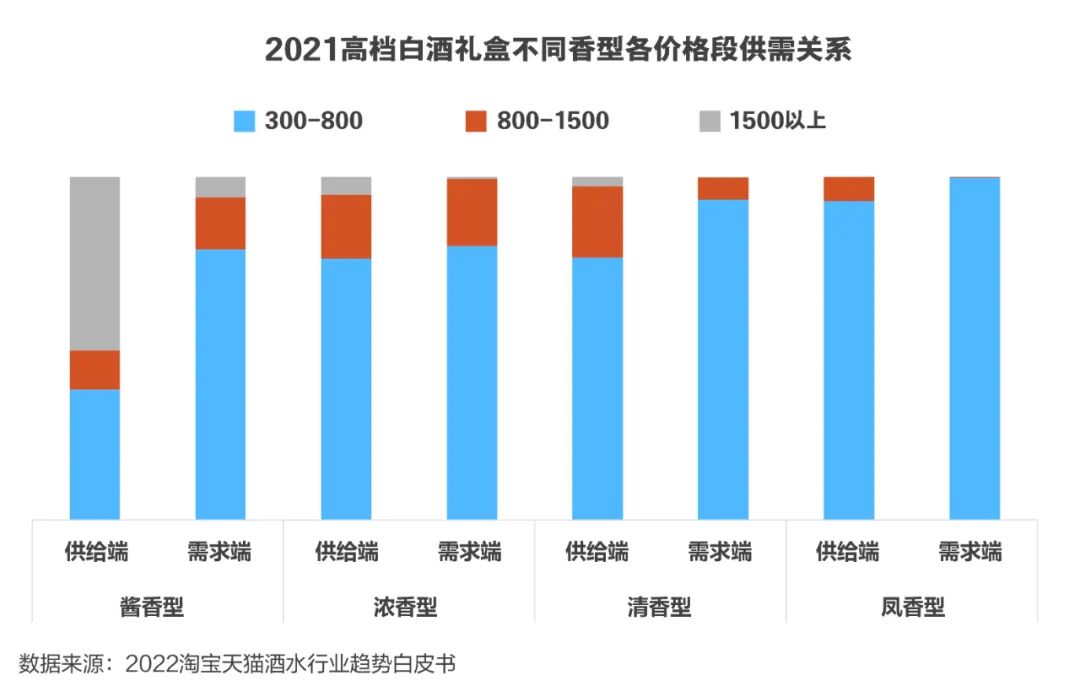 聚焦到禮盒的價(jià)格,高端白酒主流銷售價(jià)位段為300-800元;800-1500元價(jià)格段增速迅猛,潛力較大。分香型來看,醬香型白酒禮盒供給需求同比下滑,濃香、鳳香、清香型等白酒禮盒市場需求增大。濃香型在300-800元、800-1500元價(jià)格帶,清香、鳳香在300-800元價(jià)格帶,商品供給空間充足。