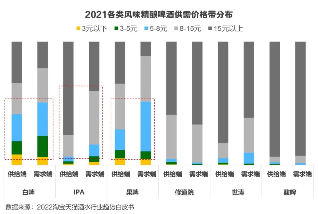精釀啤酒因其風(fēng)味多元越來越受到不同人群的喜愛,白啤是最受消費(fèi)者歡迎的風(fēng)味啤酒。根據(jù)2021年各類風(fēng)味精釀啤酒供需價(jià)格帶分布,白啤3-8元可加大貨品供給;IPA商品多集中于15元以上,可向8-15元轉(zhuǎn)移;修道院則在15元以上存在供給機(jī)會(huì)。