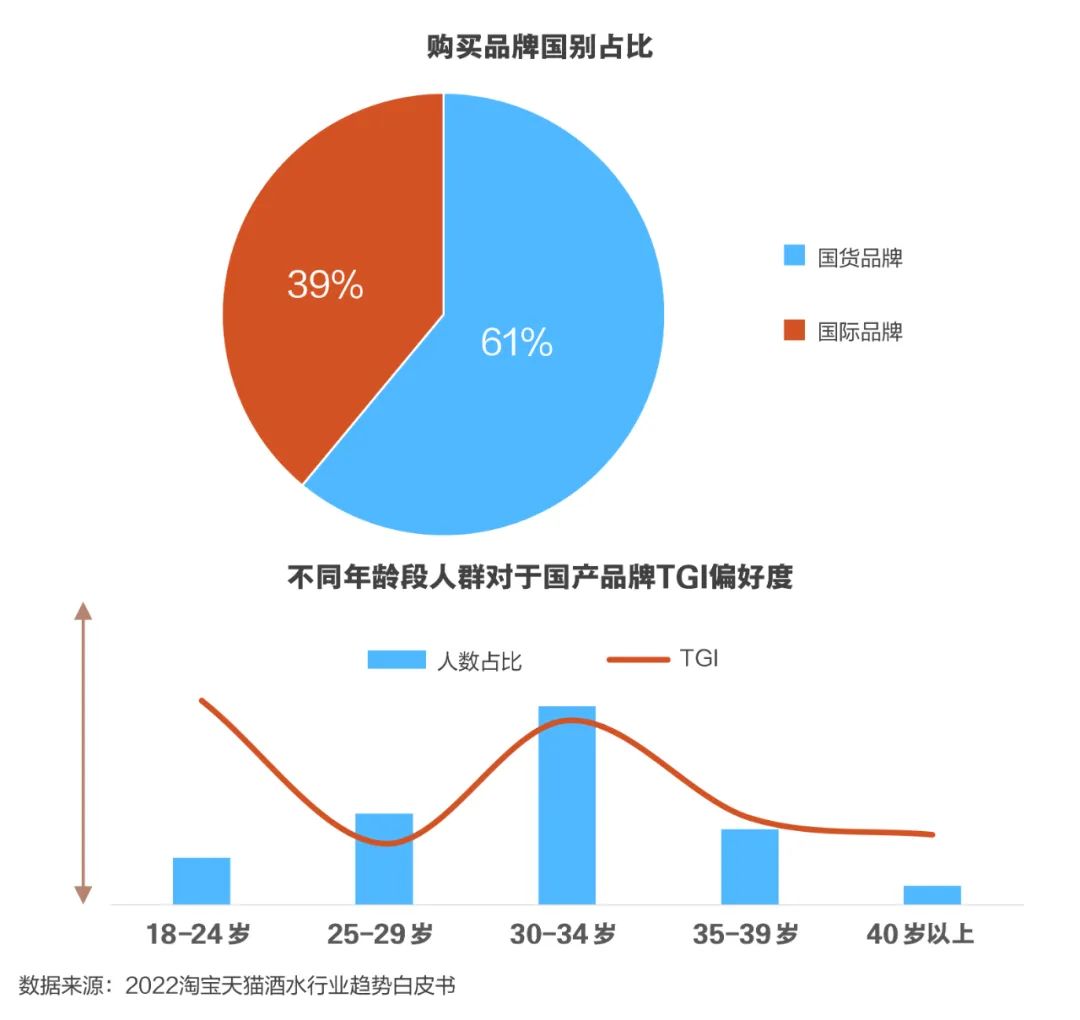 其中,高價(jià)酒種價(jià)格持續(xù)走高,驅(qū)動(dòng)市場規(guī)模增長。國產(chǎn)白酒憑借高客單和深厚的群眾基礎(chǔ)占據(jù)市場主導(dǎo)地位,洋酒受人群增長和客單提升雙驅(qū)動(dòng)保持高速增長,果酒、啤酒雖然價(jià)格有一定程度下跌,但客群體量大幅提升,行業(yè)整體客群呈現(xiàn)出年輕化、高端化態(tài)勢。
