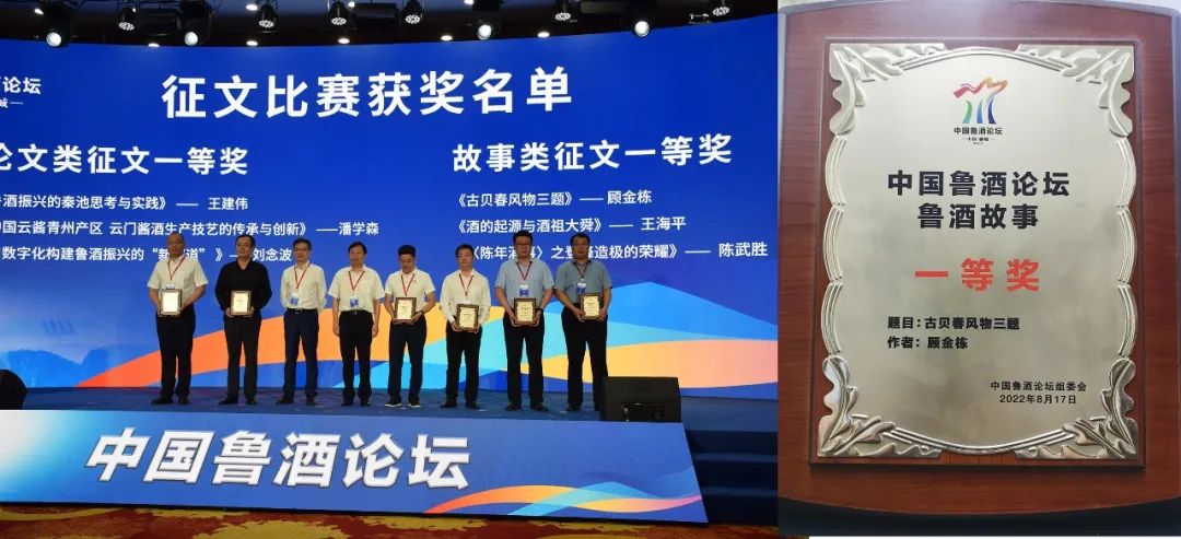 同時,中國魯酒論壇征文比賽結(jié)果現(xiàn)場揭曉,由顧金棟創(chuàng)作的文學(xué)作品《古貝春風(fēng)物三題》獲“中國魯酒論壇‘魯酒故事’一等獎”。顧金棟(右三)上臺領(lǐng)獎。