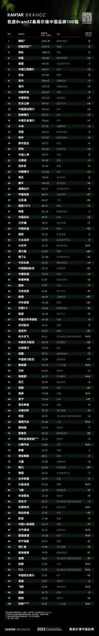 8月25日午間,2022年凱度BrandZ最具價值中國品牌百強榜單發(fā)布,茅臺以1084.9億美元的品牌價值位列第三,僅次于騰訊和阿里巴巴。榜單上,只有前三強的品牌價值超過了千億美元。