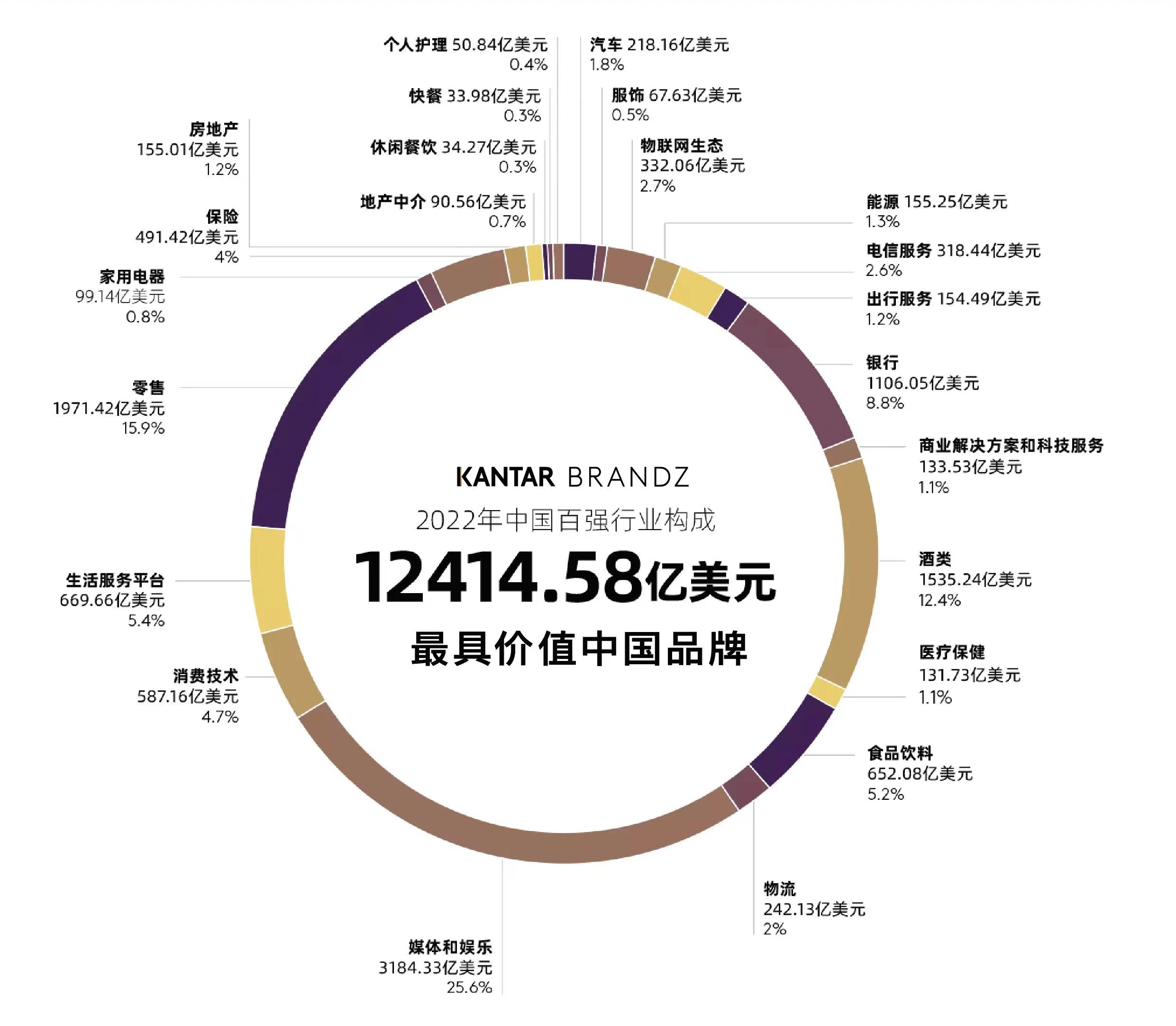 在2022年凱度BrandZ最具價值中國品牌100強合計12414.58億美元的品牌總價值中,酒類占到了1535.24億美元,占比達到了12.4%。