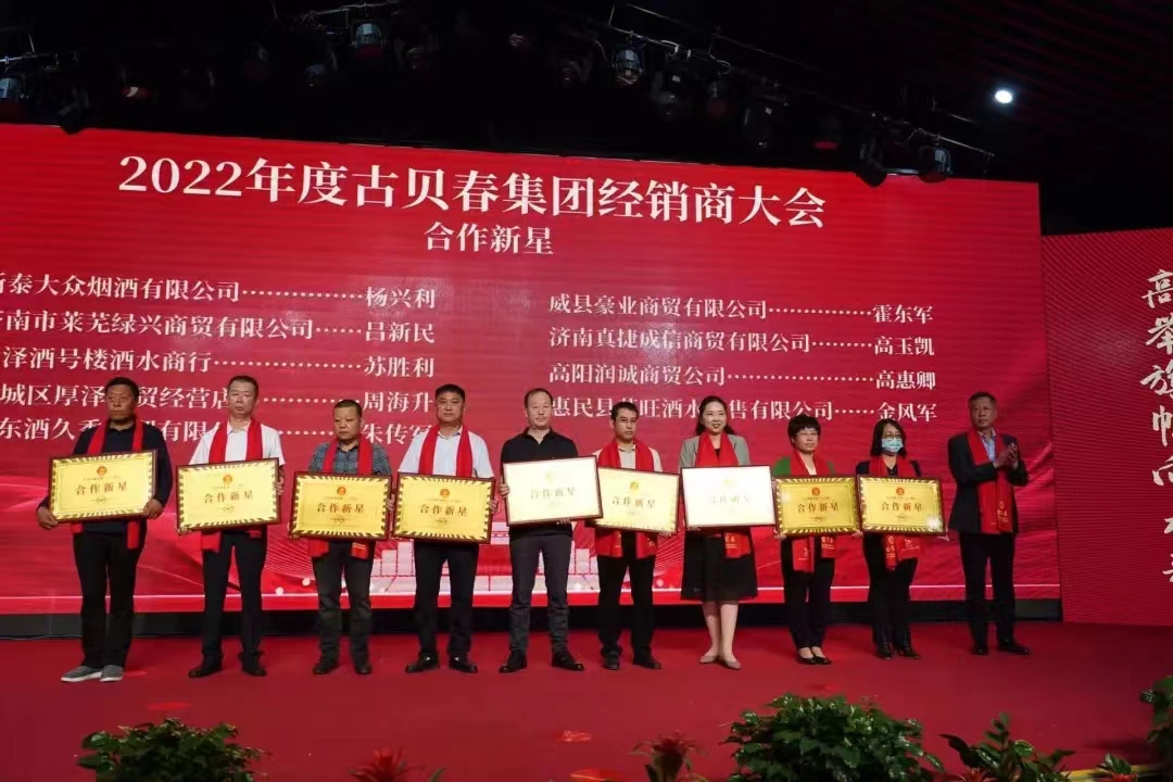 70年廠商攜手,新老經銷商始終信賴古貝春、選擇古貝春,古貝春也給予他們超預期回報。會議集中表彰了一批優秀經銷商,分別授予他們“卓越貢獻獎”“合作貢獻獎”“合作新星”“模范經銷商”和“優秀經銷商”榮譽稱號。趙殿臣宣讀了獲獎名單和頒獎詞。集團公司領導徐秀菊、張洪昌、孫步東、杜新勇、韓東昌、顧金棟分別為他們頒獎并合影留念。