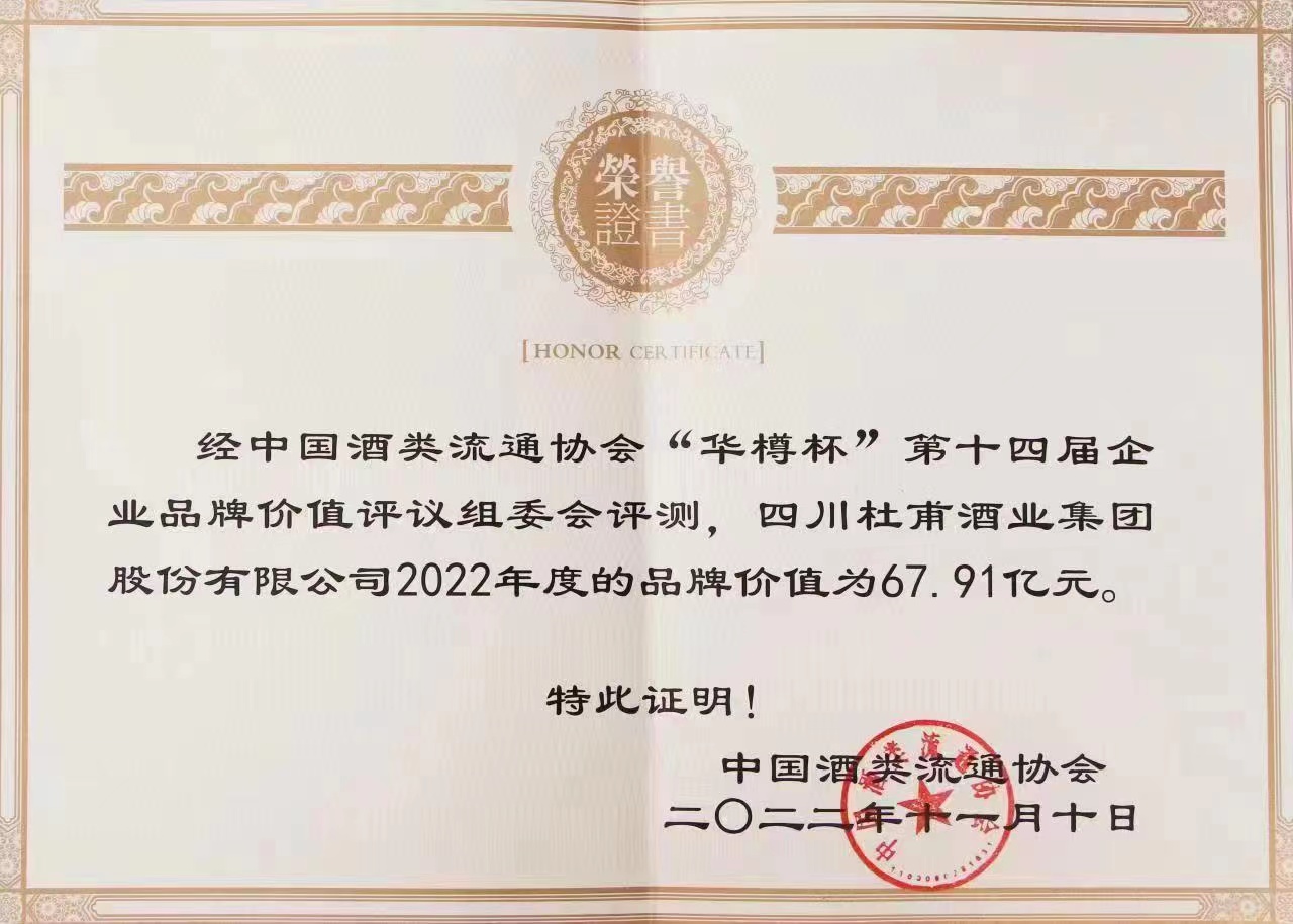 11月10日,“華樽杯第14屆中國酒業200品牌價值”在貴陽發布。經中國酒類流通協會“華樽杯”第十四屆企業品牌價值評議組委會評測,四川杜甫酒業集團股份有限公司2022年度的品牌價值為67.91億元,成功入選中國酒業品牌價值200強。該品牌價值比2019年增長31.05億元,增幅達到84%,創下新高。