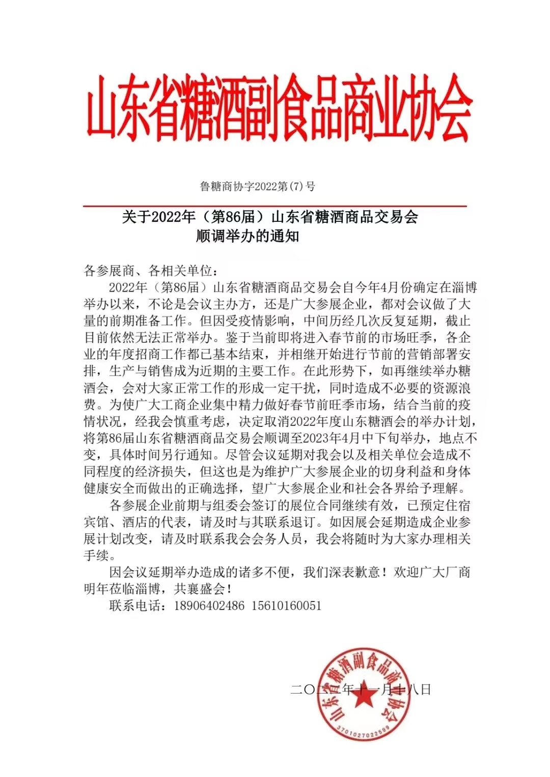 11月18日,山東省糖酒副食品商業協會發布《關于2022年(第86屆)山東省糖酒商品交易會》順調舉辦的通知。通知顯示,為使廣大工商企業集中精力做好春節前旺季市場,結合當前的疫情狀況,經我會慎重考慮,決定取消2022年度山東糖酒會的舉辦計劃,將第86屆山東省糖酒商品交易會順調至2023年4月中下旬舉辦,地點不變,具體時間另行通知。