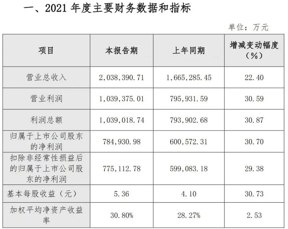 3月11日晚間,瀘州老窖披露2021年業績快報,公司實現營業總收入203.84億元,同比增長22.4%;歸母凈利潤78.49億元,同比增長30.7%。