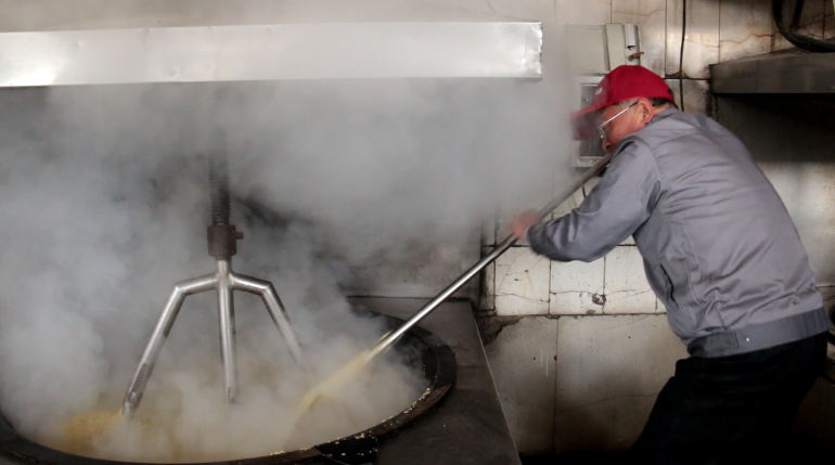 在糗糜車間,于秦峰開啟了鏟米第一耙。接下來,生產(chǎn)不忘防疫的釀酒師傅們,人人佩戴口罩,虔誠而嫻熟地?fù)]舞著鏟耙,蒸煮、糊化、發(fā)酵、壓榨……實踐著于秦峰積累30多年生產(chǎn)經(jīng)驗提煉出來的即墨傳統(tǒng)老酒釀造精髓——“糗糜法”。傳統(tǒng)老酒生產(chǎn)工序環(huán)環(huán)相扣,頃刻間,整個釀造車間彌漫著氤氳的熱氣和酒香,奏響了一曲蕩氣回腸又韻味無窮的“春之聲”,妙府老酒新春第一甑美酒正汩汩冒出。