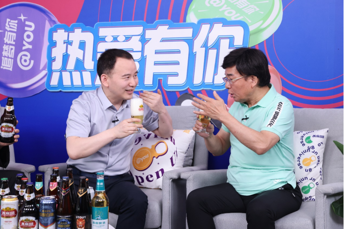 燕京啤酒董事長耿超(左)在直播間積極互動