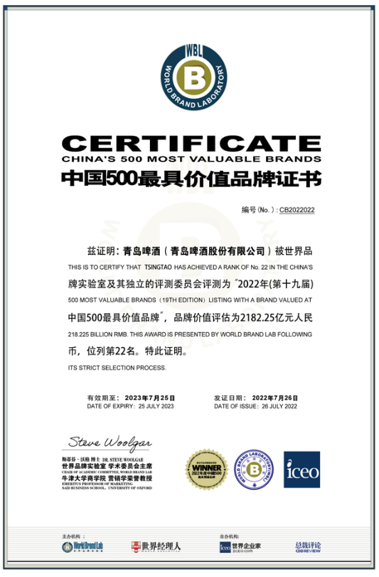 7月26日,由世界品牌實驗室(World Brand Lab)主辦的(第十九屆)“世界品牌大會”在北京舉行,會上發布了2022年《中國500最具價值品牌》榜單,青島啤酒以2182.25億元的品牌價值首次突破兩千億元,連續19年蟬聯中國啤酒行業首位。