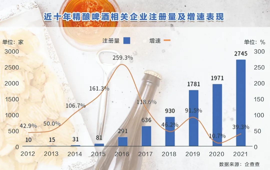企查查數(shù)據(jù)顯示,近十年,我國(guó)精釀啤酒相關(guān)企業(yè)注冊(cè)數(shù)量逐年穩(wěn)步增加。2016年達(dá)增速巔峰,同比大幅增加259.3%,達(dá)291家;2019年注冊(cè)量突破1000家,全年新增1781家,同比增加91.5%;2020年、2021年新注冊(cè)企業(yè)數(shù)量分別同比增加10.7%、39.3%至1971家、2745家。