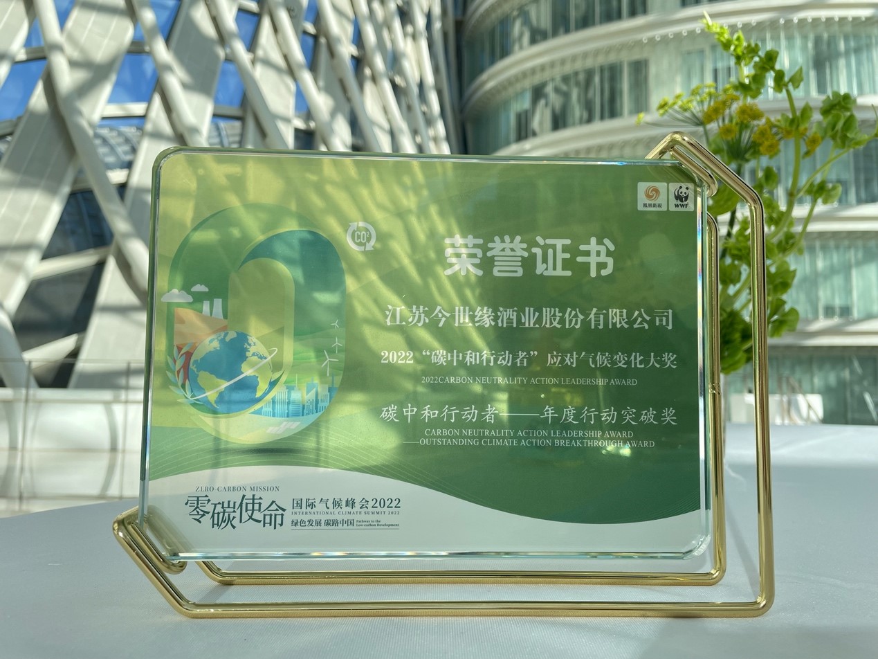 11月1日,2022零碳使命國際氣候峰會“碳中和行動者”大獎在京揭曉,江蘇今世緣酒業股份有限公司榮獲“年度行動突破獎”。