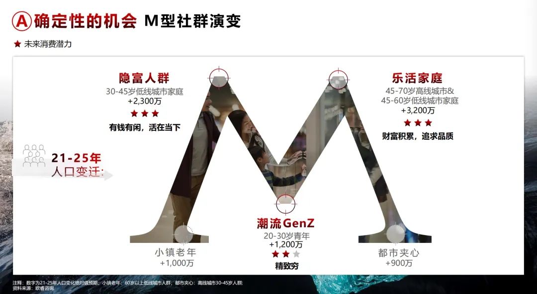 “M”型社群演變清晰地告訴大家,兩大核心人群:樂活家庭和隱富人群,也包括GenZ,帶來了未來的增長機會。樂活家庭是被忽略的價值高地:45歲以上的家庭(21-25年有3200萬的人口增量)、改革開放的財富積累可觀、家庭生活壓力較小、追求品質樂意消費。隱富人群也是已經值得關注的一個群體:20-45歲低線城市家庭(21-25年有2300萬的人口增量)、可謂是有錢有閑,他們樂意活在當下、消費升級。而大家關注的Gen Z的人口增量減緩,生活壓力增長,消費意愿趨向“精致窮”,用更合適的方法、更合理的價格、更適當的頻次維持生活品質。