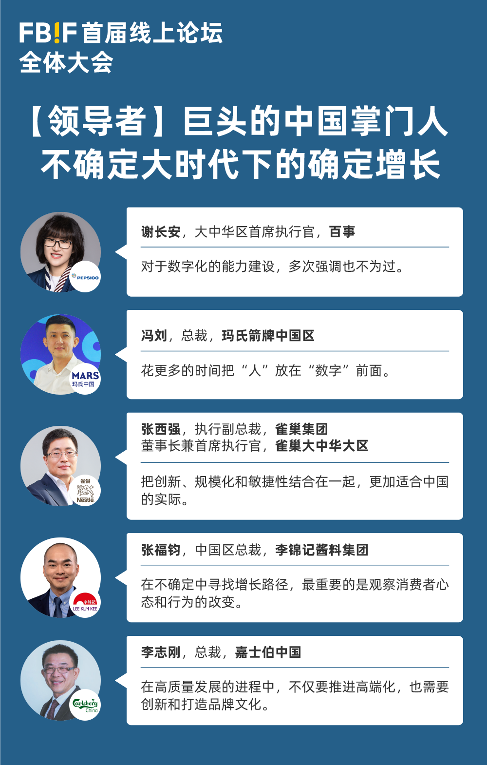 在貝恩公司全球專家合伙人魯秀瓊的主持下,雀巢集團執行副總裁&雀巢大中華大區董事長兼首席執行官張西強;百事大中華區首席執行官謝長安;李錦記醬料集團中國區總裁張福鈞;瑪氏箭牌中國區總裁馮劉;嘉士伯中國總裁李志剛,5位嘉賓就“不確定大時代下的確定增長”的主題進行了交流與分享。