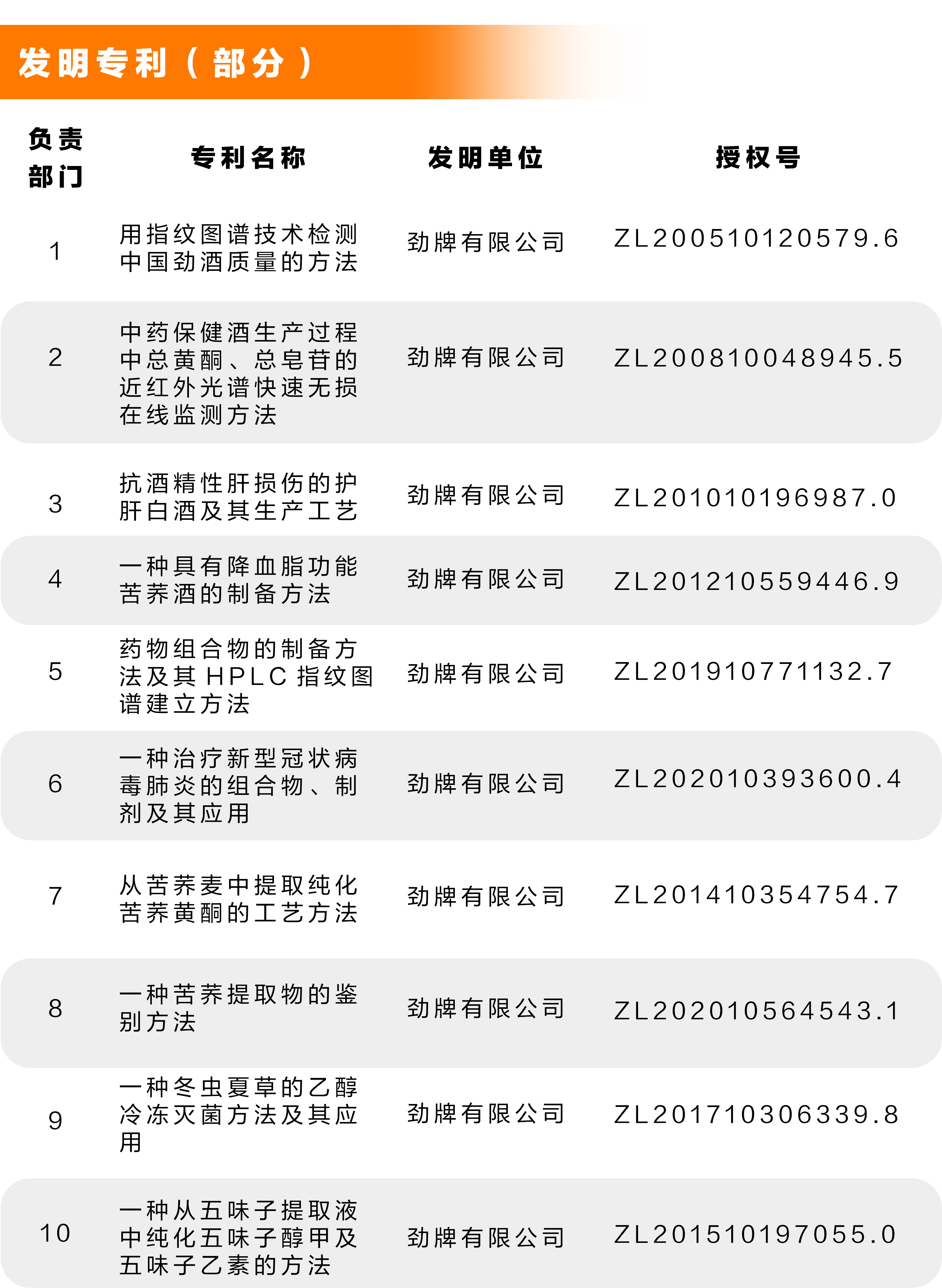 截至目前,勁牌公司擁有國家授權發明專利75件,被評為國家知識產權先進示范單位。其中, “中國勁酒緩解體力疲勞主效成分群研究”“毛鋪苦蕎酒及其草本活性成分多途徑輔助減小肝損傷作用機制研究”等16項科技成果被鑒定為國際領先或國際先進水平。
