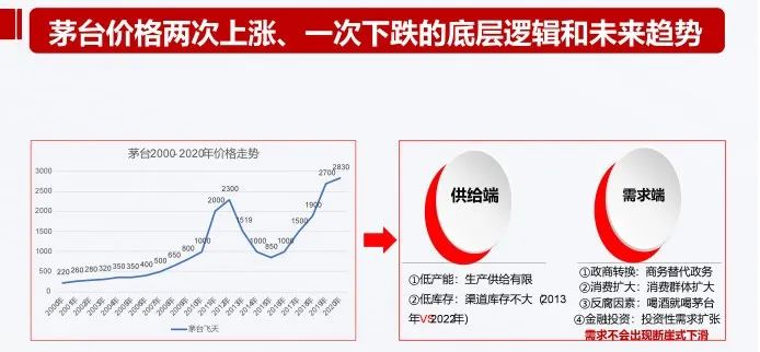 2013年行業禁酒令、國家宏觀經濟去產能因素疊加,政務消費采購被掐斷,商務消費量下滑,整體上需求端出現斷崖式下滑,茅臺價格腰斬。