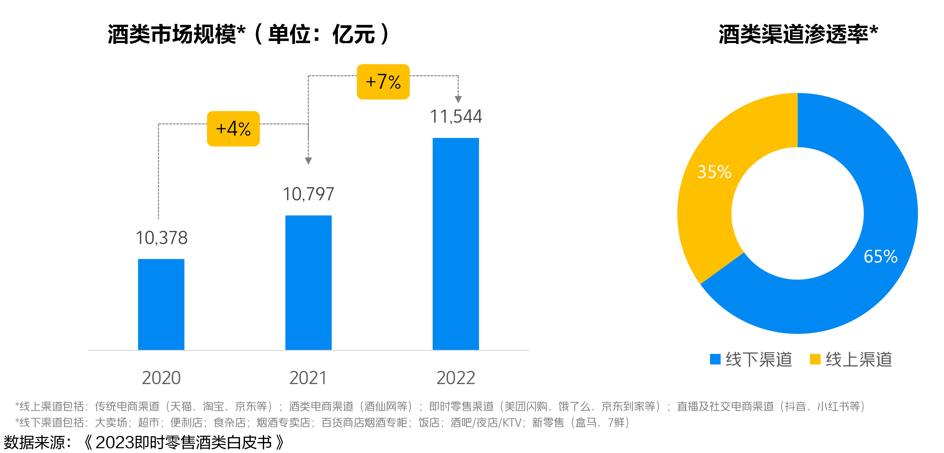 《白皮書》顯示,酒類渠道滲透率方面,線上渠道滲透率已達35%。線上渠道包括傳統綜合電商渠道,例如天貓、淘寶、京東等;酒類垂直電商渠道包括1919酒類直供、酒仙網等;即時零售渠道,如美團閃購、餓了么、京東到家等;直播及社交電商渠道,如抖音、小紅書等。