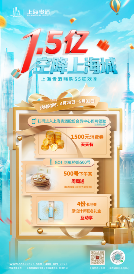 作為以消費者體驗為重要引擎的創新型酒業公司,上海貴酒一直堅持以消費者需求為出發點,不斷創新消費場景,通過精耕細極致體驗去匹配消費者的消費需求。本屆“五五購物節”期間,上海貴酒創新策劃“五五新飲力”主題系列活動,推出多項惠民舉措,為消費者奉送“真金白銀”的消費補貼。上海貴酒將發放價值1.5億元的消費券大禮包,包含3重大禮:成為上海貴酒會員中心新會員即可領取價值1500元消費券;每周五限量發放100份下午茶套餐券;除此之外,幸運的消費者還有機會獲得上海貴酒與卡地亞前設計師聯名合作的上海貴酒·天青限量版禮盒。消費者只需關注“上海貴酒股份會員中心”小程序,便有機會獲得以上福利。
