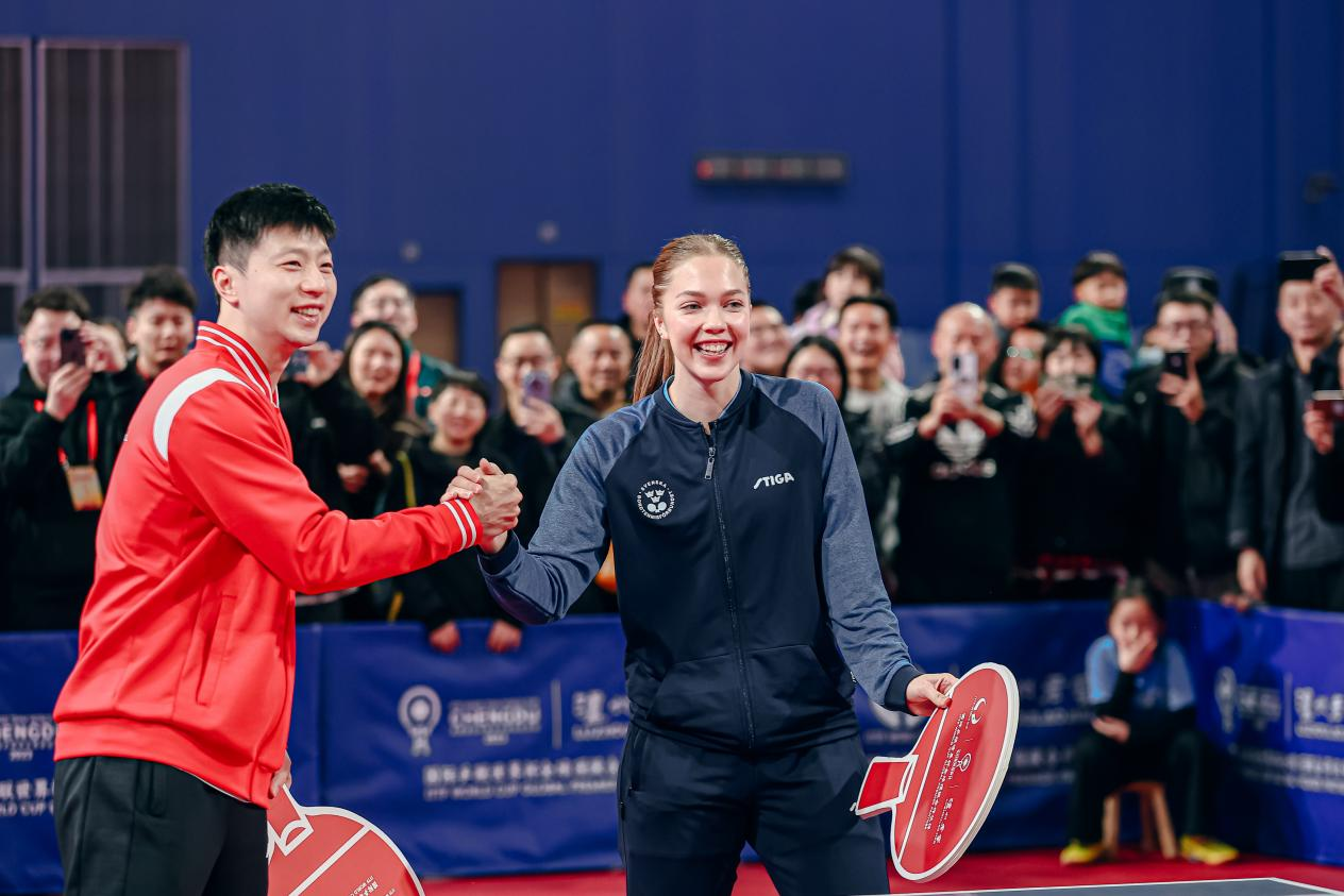 ▲奧運(yùn)冠軍、乒乓球運(yùn)動(dòng)員馬龍(左)與瑞典著名乒乓球運(yùn)動(dòng)員克里斯蒂娜·卡爾伯格(右)