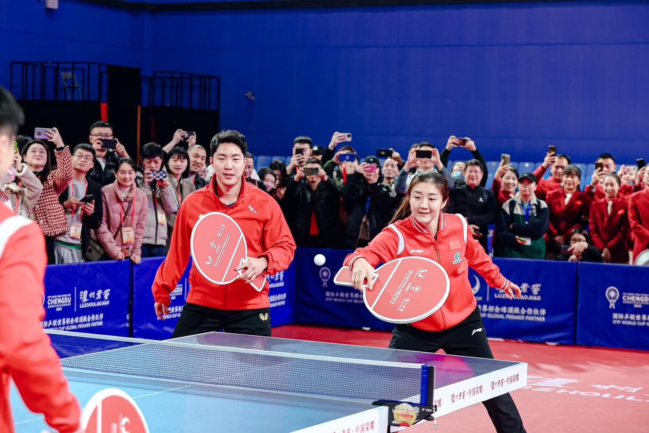 發(fā)布儀式結(jié)束后,作為見證嘉賓代表,奧運(yùn)冠軍、乒乓球運(yùn)動(dòng)員馬龍,奧運(yùn)冠軍、乒乓球運(yùn)動(dòng)員陳夢與瑞典著名乒乓球運(yùn)動(dòng)員克里斯蒂娜·卡爾伯格,韓國著名乒乓球運(yùn)動(dòng)員林仲勛共同帶來“明星表演賽”,為即將于12月4日在成都正式開打的本屆混合團(tuán)體世界杯比賽預(yù)熱。雙方你來我往,切磋球技,不僅為現(xiàn)場眾多乒乓球愛好者帶來一場精彩“對決”,也將“全民迎世界杯”的氛圍推向了高潮。
