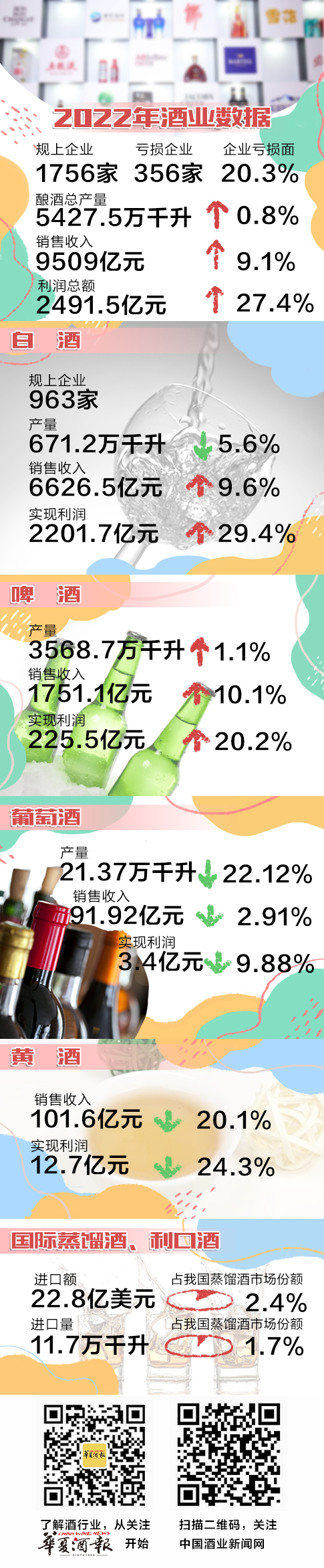數據顯示,2022年全國釀酒產業規模以上企業完成釀酒總產量5427.5萬千升,同比增長0.8%,主要經濟效益匯總的規上企業1756家,累計完成產品銷售收入9509億元,同比增長9.1%;累計實現利潤總額2491.5億元,同比增長27.4%。