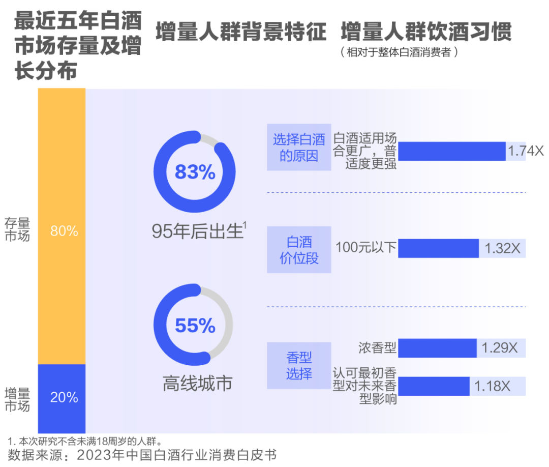 值得注意的是,最近五年,白酒市場涌入了兩成新進消費群體。不同于存量人群,增量人群呈現更年輕、居住在高線城市、初入職場等特征。83%的增量人群在1995年后出生,55%居住在高線城市。由于年紀尚輕,大部分仍在企業中擔任較為初級的職位。他們選擇白酒更多由于加入職場后,白酒的場合普適性較其他酒種更廣。但基于經濟實力,他們更偏好100元以下的產品,濃香型的產品更為他們所偏愛。而“第一口酒”的影響對于這群人來說更為突出,品牌想要深度獲取和培育新消費人群,需要重視年輕群體的溝通,并加強香型教育和影響。
