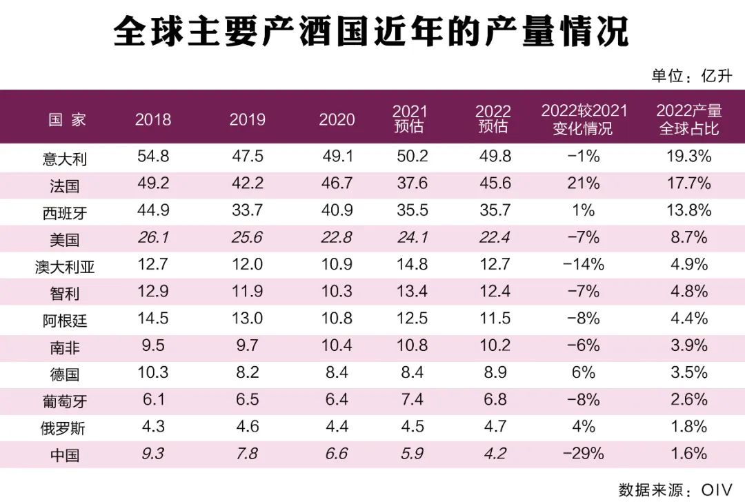 在北美,由于早期霜凍災(zāi)害、夏季干旱以及某些葡萄酒產(chǎn)區(qū)缺水,美國2022年的葡萄酒產(chǎn)量估計(jì)為22.4億升,比2021年低7%,比5年平均水平低9%。