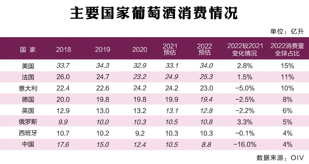 2022年,美國仍是全球最大的葡萄酒消費(fèi)國,估計(jì)其消費(fèi)量為34億升,與2021年相比增長了近3%,恢復(fù)到疫情前水平。