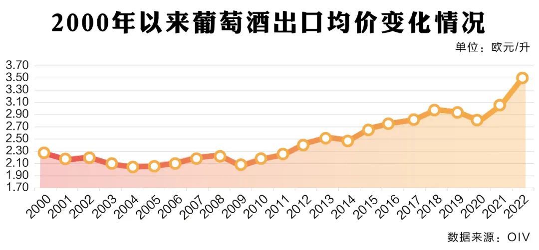 在2020年因疫情的相關(guān)限制而導(dǎo)致全球貿(mào)易中斷之后,隨后迎來了創(chuàng)紀(jì)錄的一年,葡萄酒貿(mào)易似乎走上了復(fù)蘇軌道。但2022年葡萄酒出口受到烏克蘭戰(zhàn)爭和能源危機(jī)的嚴(yán)重影響,能源危機(jī)給所有主要經(jīng)濟(jì)體帶來了巨大的通脹壓力。與此同時(shí),全球供應(yīng)鏈中斷,導(dǎo)致海運(yùn)大幅放緩。這些情況導(dǎo)致葡萄酒出口量總體下降,平均價(jià)格大幅上升,與2021年相比上漲15%,全球葡萄酒出口額估計(jì)為376億歐元,創(chuàng)歷史新高。
