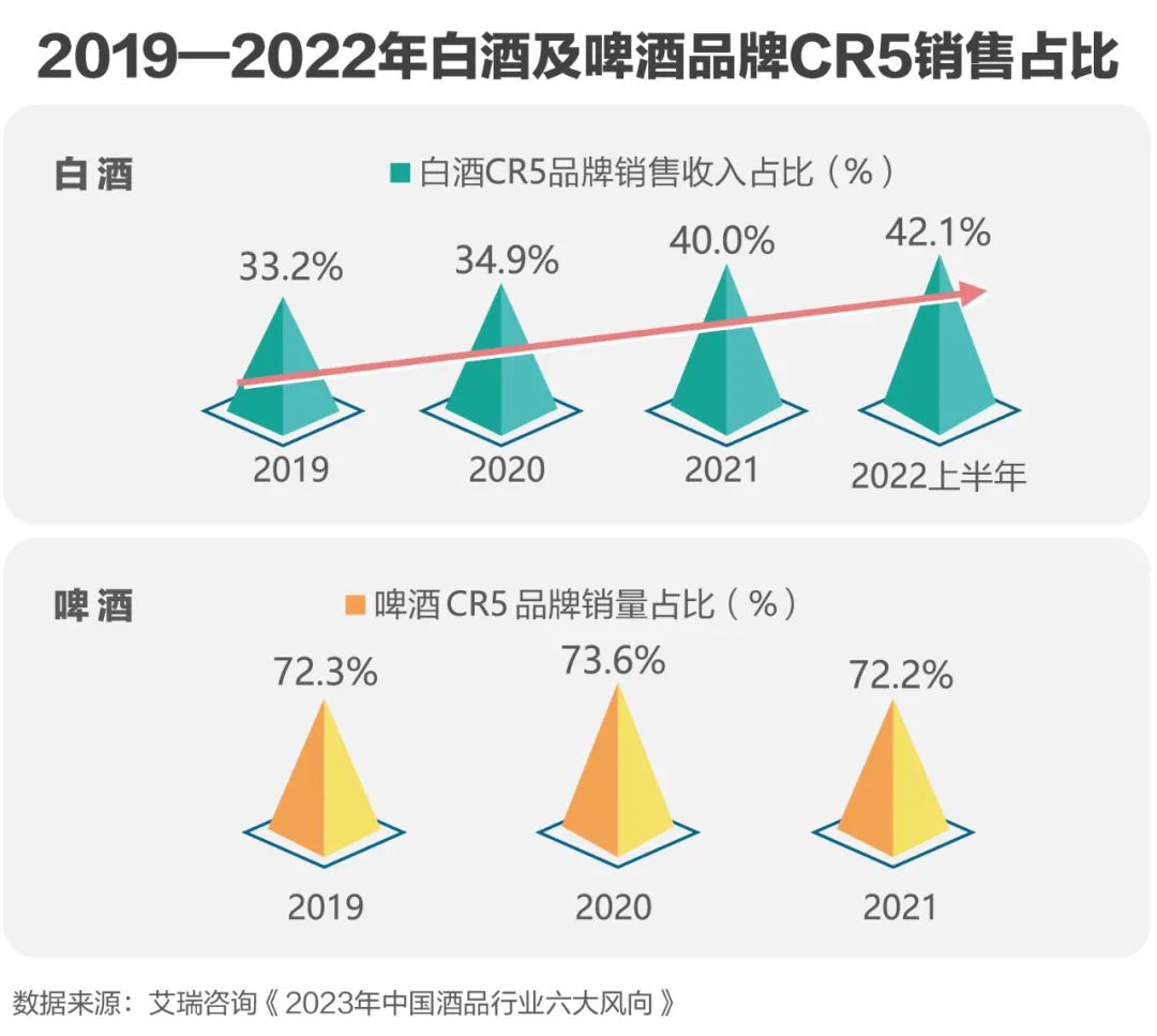 近年來,我國酒行業產量整體呈現下降趨勢,市場集中度逐漸升高。除啤酒微漲,其他酒種產量持續下降。數據顯示,自2016年以來,中國白酒產量逐年下降,2022年產量僅為2016年的49%;啤酒產量微漲,但CR5品牌銷量占比已達70%以上;葡萄酒產業自2018年以來,產量、銷售額、利潤持續下降。