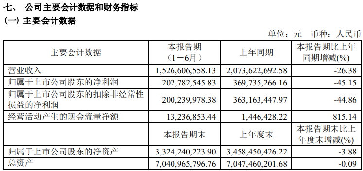 公告顯示,2023年上半年,水井坊實(shí)現(xiàn)營(yíng)業(yè)總收入15.27億元,同比下降26.38%;歸母凈利潤(rùn)2.03億元,同比下降45.15%;扣非凈利潤(rùn)2.00億元,同比下降44.86%。