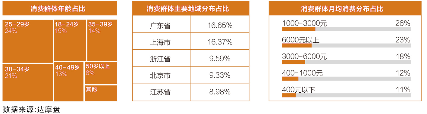 根據(jù)天貓旗艦店數(shù)據(jù)顯示,目前,中國的威士忌主要消費(fèi)群體的年齡段,以40歲以下消費(fèi)者為主,占比達(dá)到76%,其中18-29歲的年輕消費(fèi)者占比就達(dá)到37%,威士忌消費(fèi)者整體偏年輕。從消費(fèi)者的地域分布上來看,由于洋酒文化最初進(jìn)入國內(nèi)主要集中在貿(mào)易及港口城市,因此,沿海城市消費(fèi)者占比較高,廣東省和上海市牢牢占據(jù)前二的位置。從月均消費(fèi)上來看,月均消費(fèi)超過3000元的消費(fèi)者占比41%,資深中產(chǎn)為線上威士忌消費(fèi)主力。