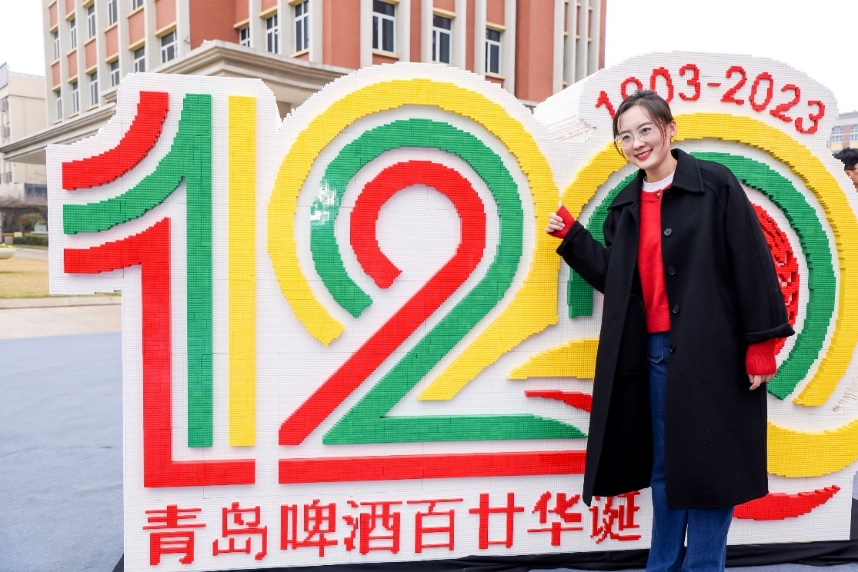 隨著樂高大師參賽選手“樹大”將最后一塊積木穩穩嵌入,一座做工精巧、數字“120”造型的巨型積木作品——青島啤酒120周年華誕紀念標識巧妙呈現在游客面前,引來眾多游客前來拍照打卡。