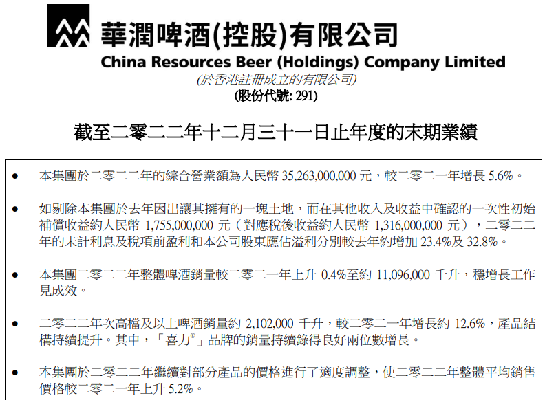 3月24日,華潤啤酒發布2022年財報。披露公司去年綜合營業額為352.63億元,同比增長5.6%;股東應占溢利43.44億元,同比下滑5.3%。