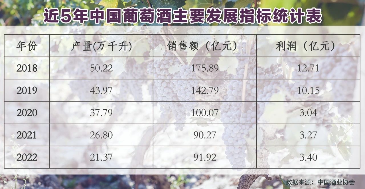 據(jù)統(tǒng)計,2017年1~12月,全國葡萄酒產量為100.1萬千升,利潤達到了33.83億元;同年,進口葡萄酒總量為74.6萬千升,進口總額為27.89億美元。到了2022年,國產葡萄酒產量已經(jīng)縮至21.37萬千升,行業(yè)利潤僅為3.4億元;而進口葡萄酒方面也延續(xù)了下滑的態(tài)勢,進口量跌至33.53萬千升,進口額為14.35億美元。
