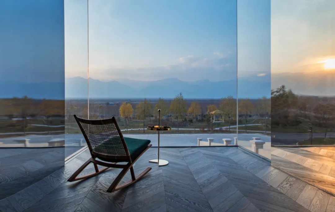 走進酒堡,藝術的氣息似是有形,卻又化為無形,融于周遭。意想不到的藝術品散落在酒堡入門的大廳里、不經意的轉角處、墻邊的板巖上;行至品鑒室,桌上的手工意式玻璃燈,好似陽光下的葡萄;餐桌盡頭的大理石墻面,黑白相間的自然紋理,像是迸發的煙火畫;穿越舊時的廊亭間,在大理石后方,便是賀蘭山腳下最美的休憩之所。