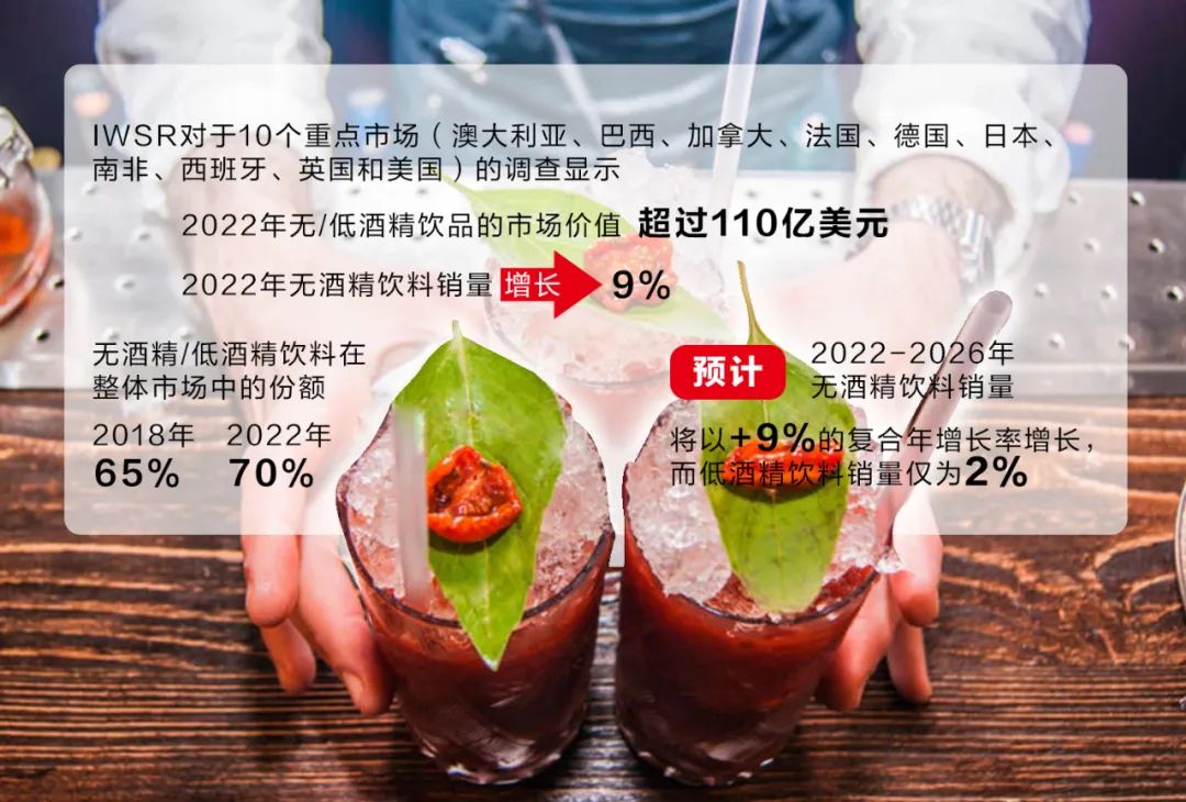口味的改善、生產技術的提高以及消費場合的多樣化,正在推動無酒精飲品在許多市場上超過低酒精飲品。IWSR預計,2022-2026年,無酒精飲品的數量將以9%的復合年增長率增長。