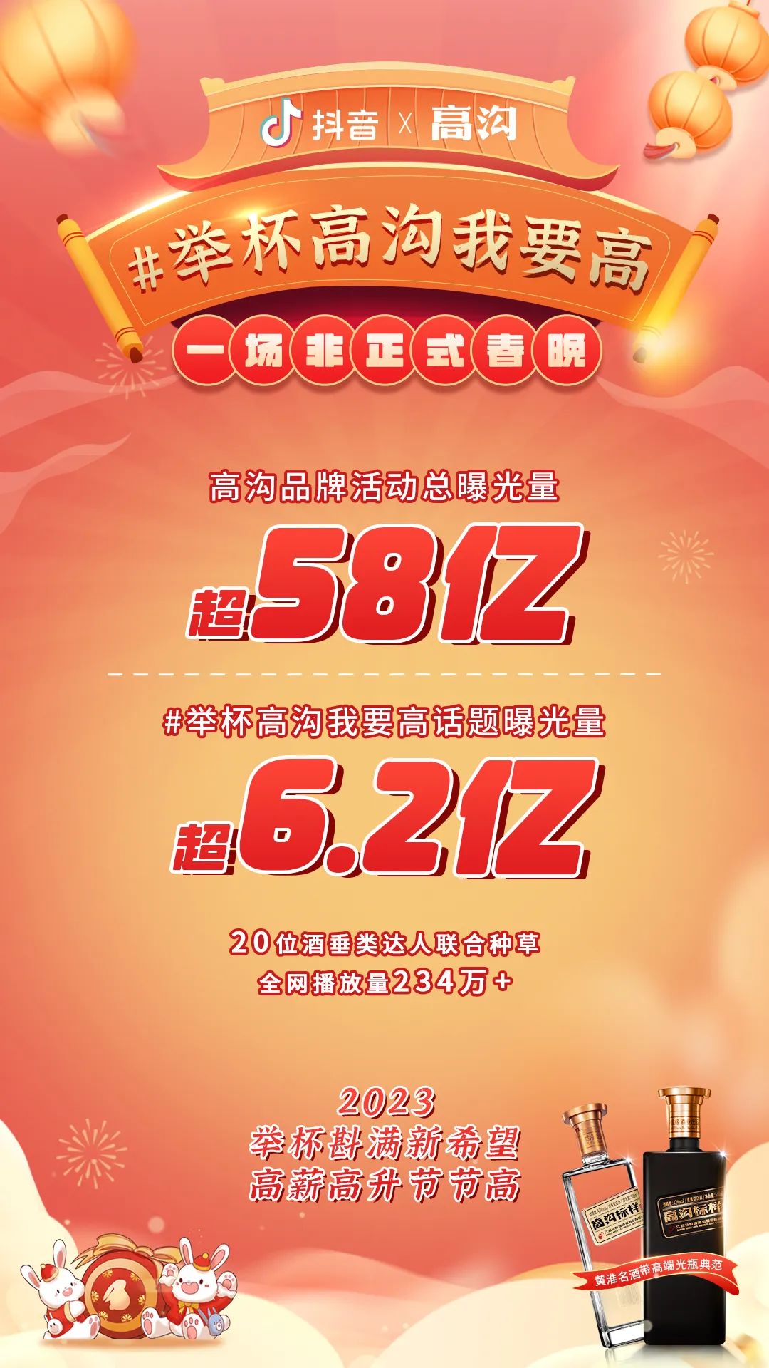 統(tǒng)計(jì)數(shù)據(jù)顯示,2023年新年又見高溝新年整合營銷傳播活動總曝光量超過58億。這之中,“一場非正式春晚”總曝光量超過25.8億,“舉杯高溝我要高”活動總曝光量超6.2億,由20位酒類垂直達(dá)人聯(lián)合種草活動全網(wǎng)播放量超過234萬+······可以說,低調(diào)的高溝正在成為整個(gè)2023年春節(jié)期間的流量明星與“C位擔(dān)當(dāng)”。