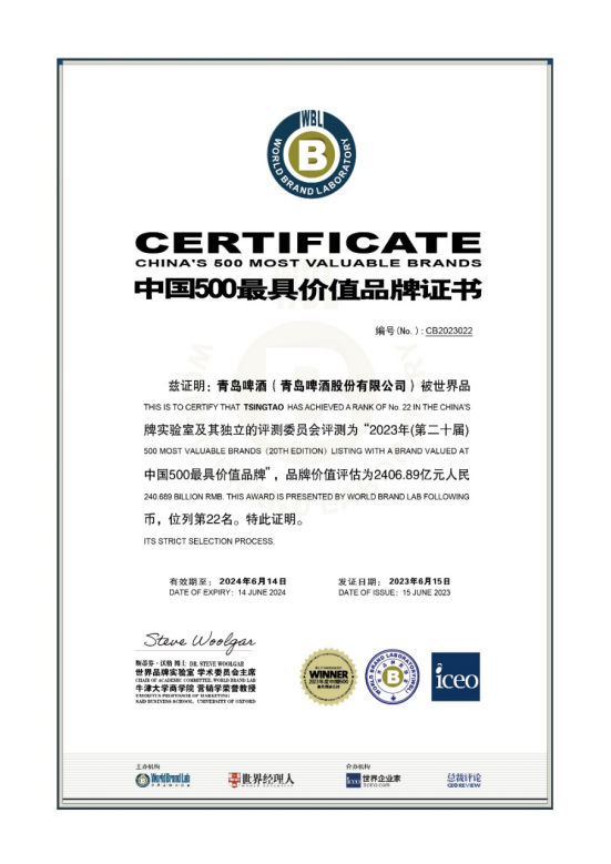 由世界品牌實驗室(World Brand Lab)主辦的(第二十屆)“世界品牌大會”于6月15日在北京舉行,會上發(fā)布了2023年《中國500最具價值品牌》榜單,青島啤酒品牌價值達2406.89億元,連續(xù)20年蟬聯(lián)中國啤酒行業(yè)品牌價值首位,青島啤酒這塊“金字招牌”在時間的洗禮和檢驗中熠熠生輝。
