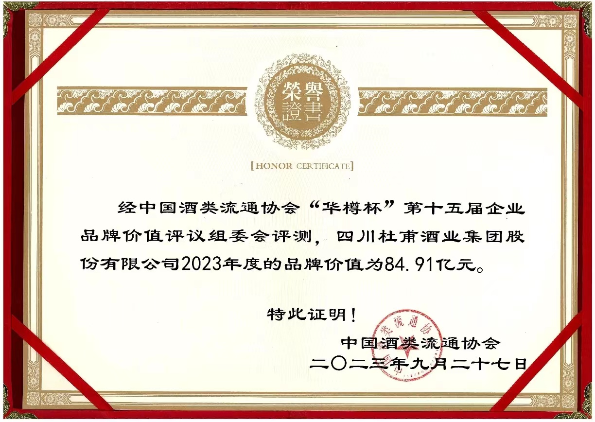 其中,四川杜甫酒業(yè)集團(tuán)股份有限公司2023年度的品牌價值為84.91億元,榮膺四川白酒企業(yè)品牌價值前十強。同時,四川杜甫酒業(yè)集團(tuán)股份有限公司斬獲“2023年度華樽杯中國文化傳承典范白酒品牌”“2023年度華樽杯中國白酒十大開拓創(chuàng)新品牌”雙項殊榮!