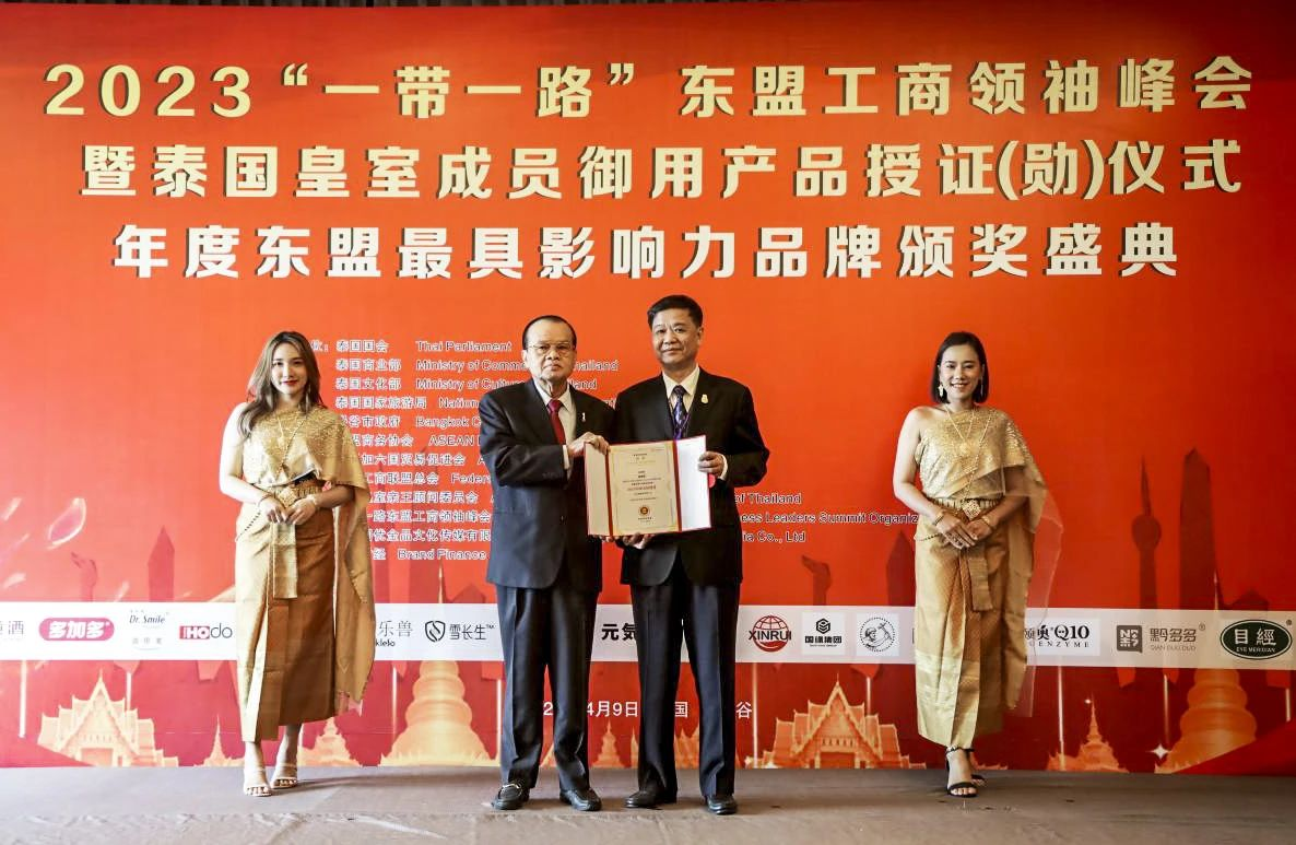 事實上,早在今年4月,在泰國曼谷舉行的由東盟加六國貿促會、東盟商務協會等主辦的2023“一帶一路”東盟工商領袖峰會暨泰國皇室成員御用產品授勛儀式上,韓公系列KAST【桑葚白蘭地】就正式成為泰國皇室成員御用酒。不僅如此,廣東柏熹酒業有限公司還獲得2023東盟最具發展潛力企業,郭森鎮更是榮獲2023中泰友好使者稱號,并接受泰國皇室剛猜親王、善猜親王授勛。