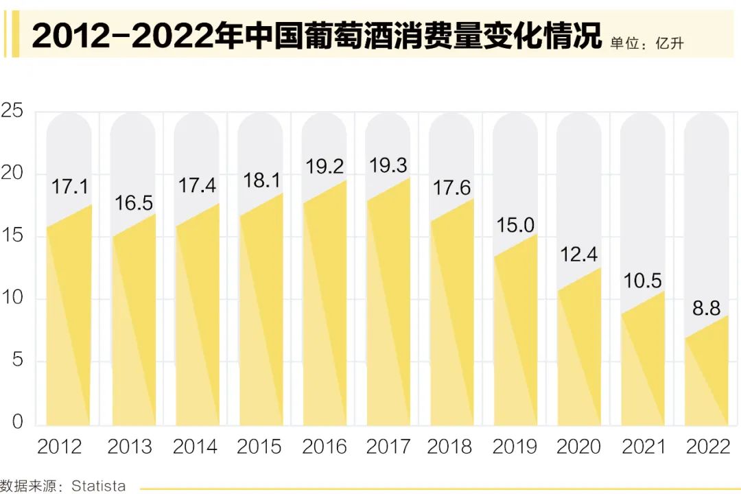 眾所周知,中國的葡萄酒消費量在過去十年里急劇下降,2022年,國產和進口葡萄酒雙雙創下新低。根據中國海關的數據,2022年進口葡萄酒的總價值為96億元人民幣(合14億美元),同比下降12.5%,這是自2019年以來連續第四年下降。