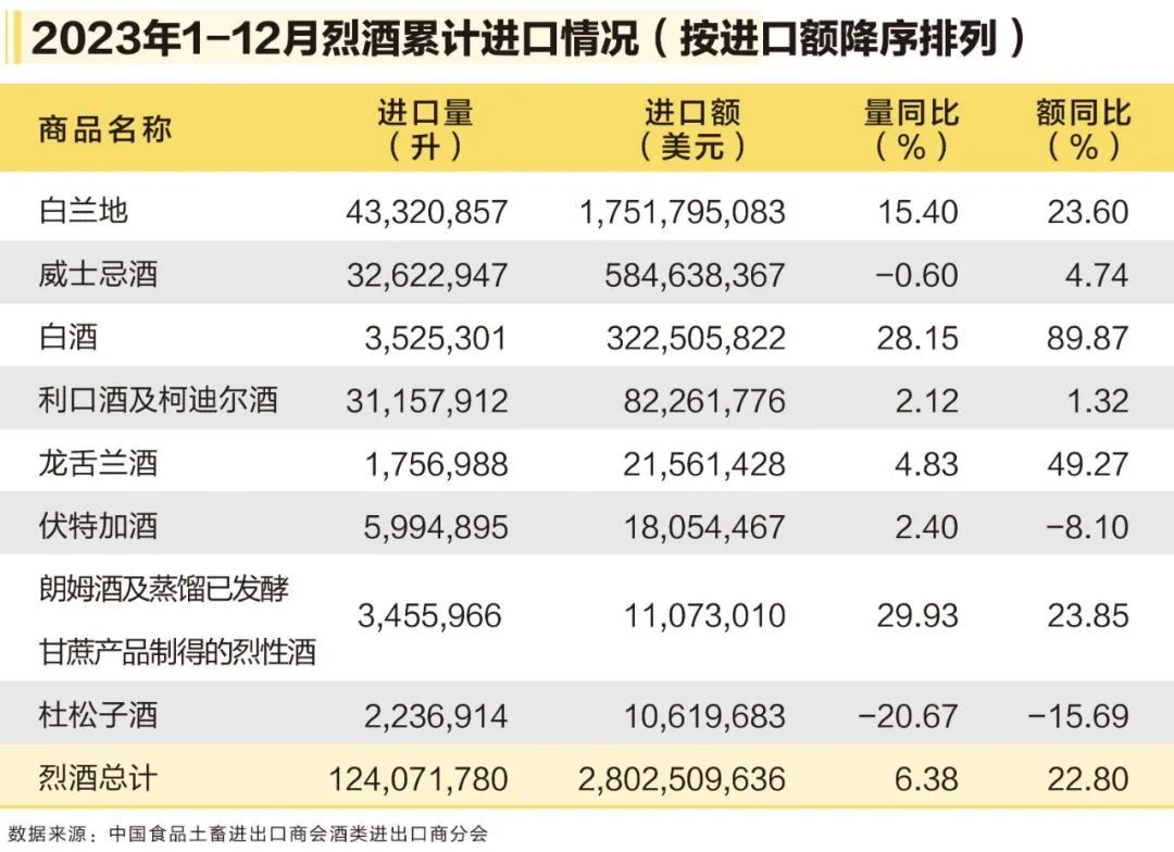數據顯示,2023年,我國烈酒進口量為1.24億升,同比增長6.38%;進口額28億美元,同比增長22.8%。烈酒市場份額占比高達60%。