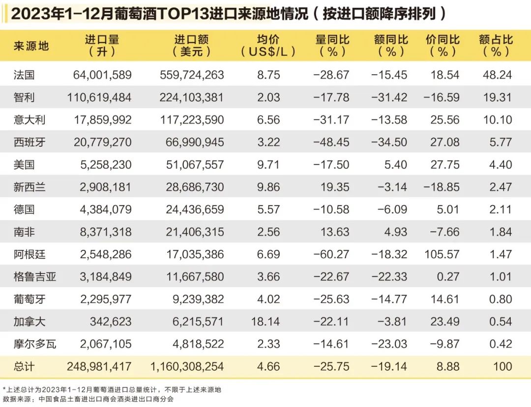 2023年,進口葡萄酒市場跌勢未緩,進口量為2.49億升,同比下降25.75%;進口額為11.6億美元,同比下降19.14%。