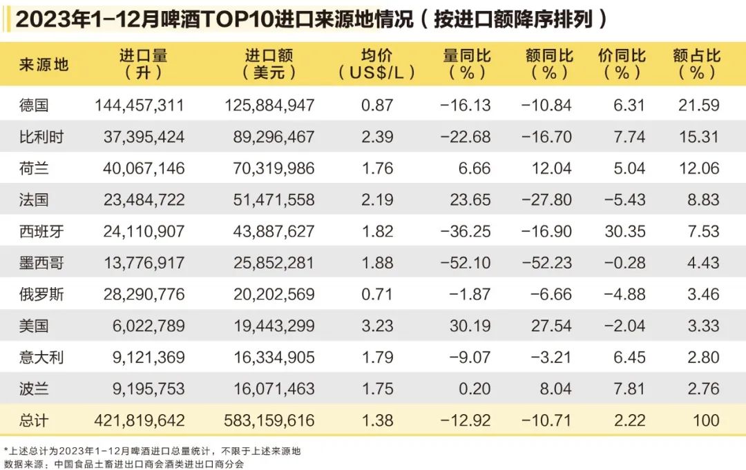 數據顯示,2023年1-12月,我國進口啤酒量為4.2億升,進口額為5.8億美元,量額分別下降12.9%和10.7%。