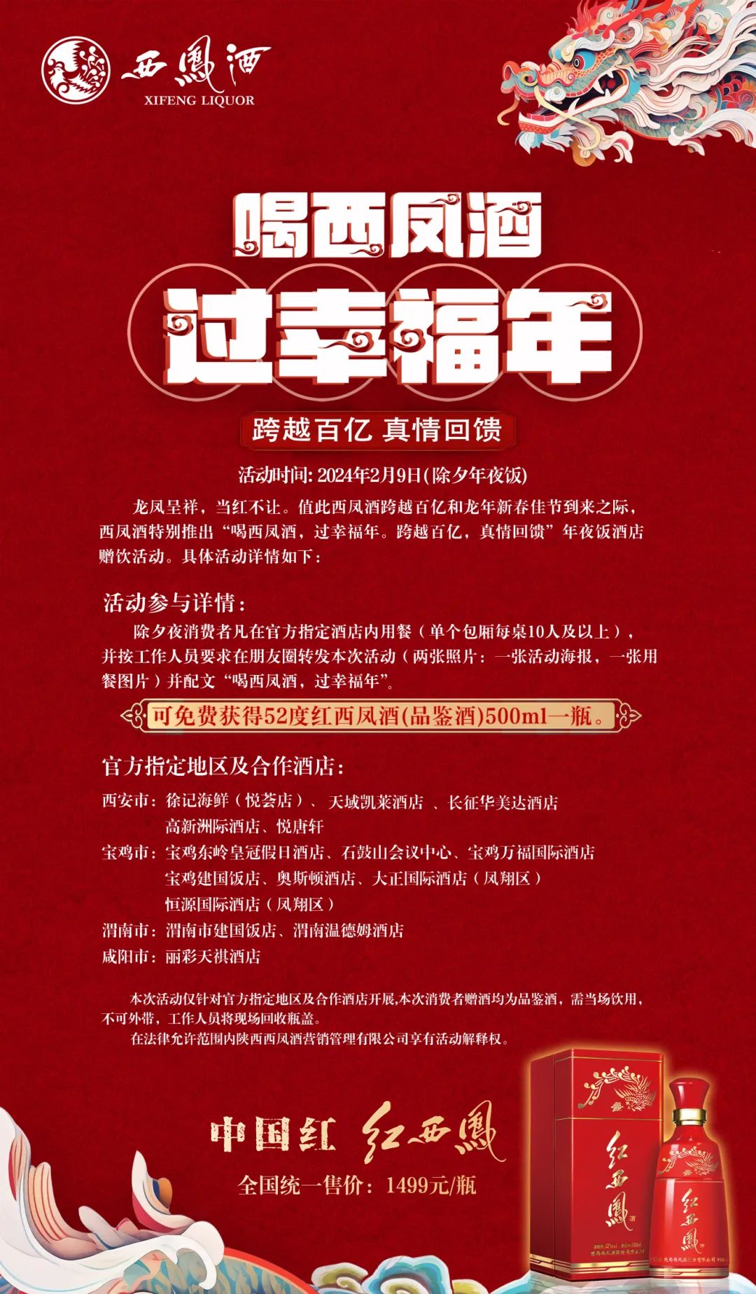 據悉,名為“喝西鳳酒、過幸福年;跨越百億,真情回饋”的終端贈酒活動將于2024年2月9日(除夕年夜飯)全面推進。