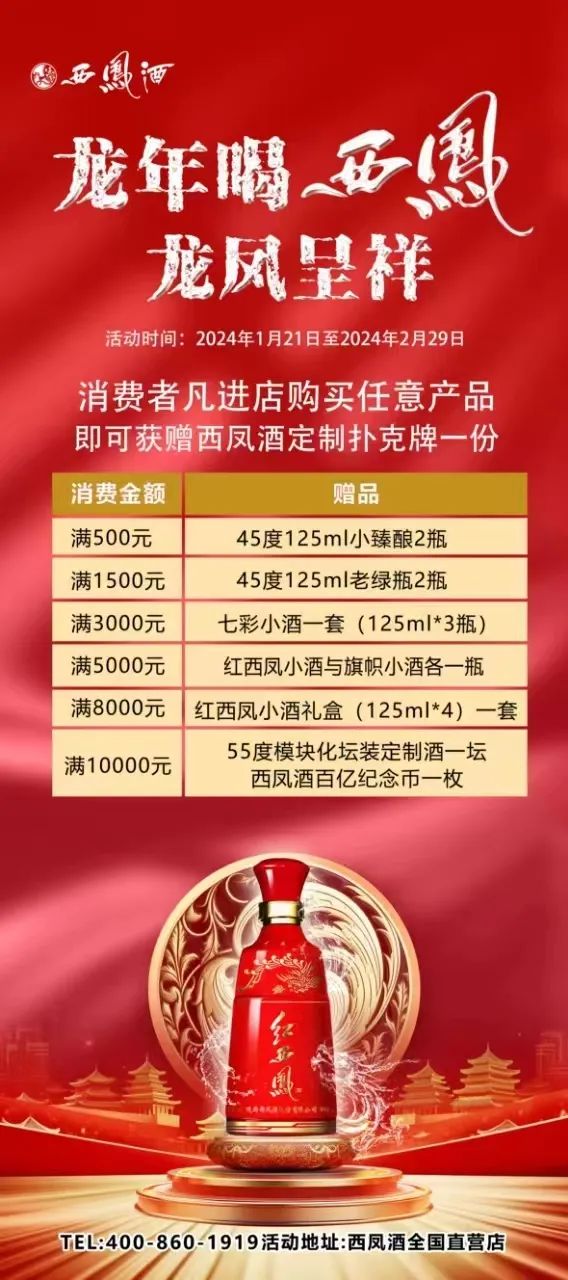 除了以紅西鳳酒、紅西鳳1978、金獎老綠瓶西鳳酒、西鳳酒珍藏版這四款主力產品為主體而發起的年夜飯贈飲活動之外,西鳳酒直營店則針對旗下所有產品展開“贈飲”活動——2024年1月21日至2024年2月29日,凡是進入直營店購買任意產品的消費者,都可根據金額大小獲贈不同的產品。