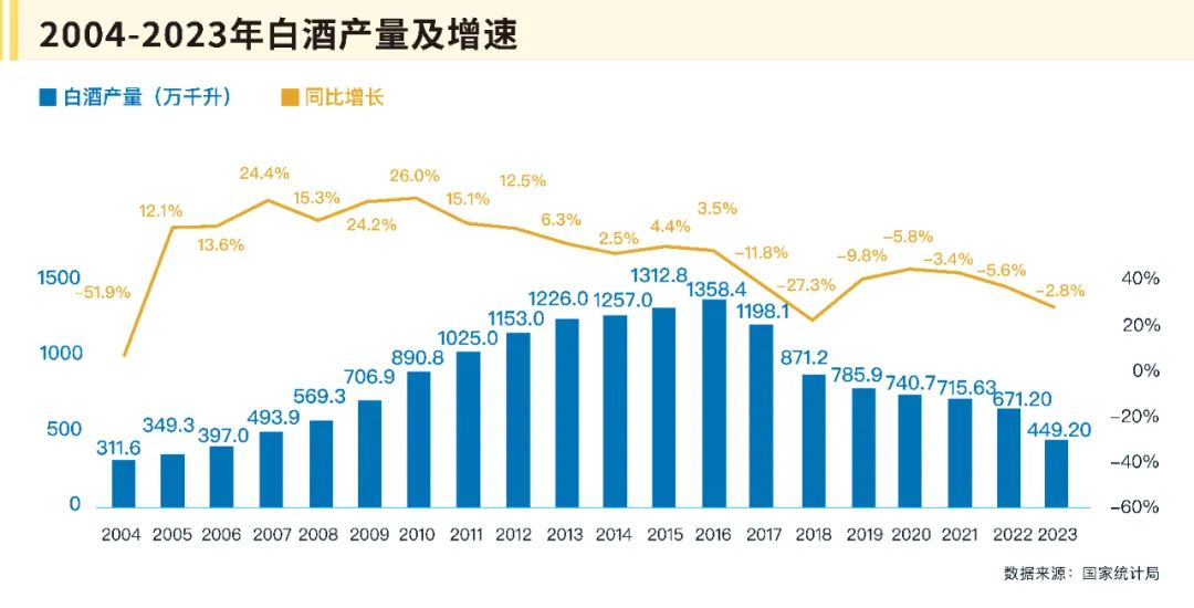 值得注意的是,國家統計局公布的數據顯示,2023年全國白酒產量449.2萬千升,較2022年的671萬千升產量減少221.8萬千升。另外,作為白酒釀造大省四川,2023年產量174.1萬千升,相比于2022年的348.05萬千升,產量下滑49.98%,達到了腰斬的地步,且全國白酒產量占比也從2022年的51.85%下滑到38.76%。
