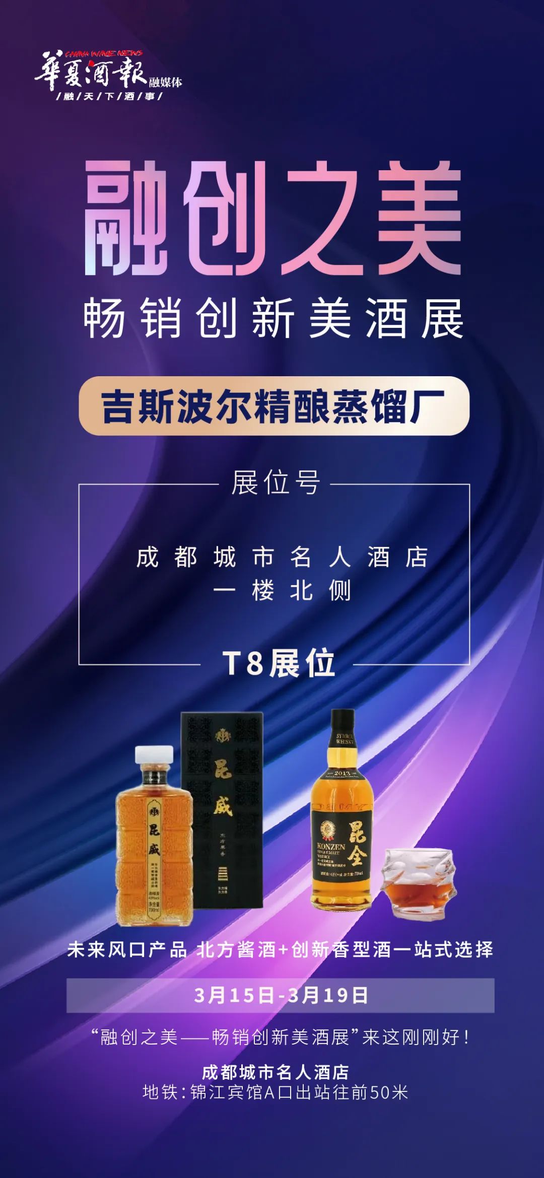 3月15日至19日,吉斯波爾精釀蒸餾廠在成都城市名人酒店一樓北側“融創之美——暢銷創新美酒展”T8展位歡迎大家!
