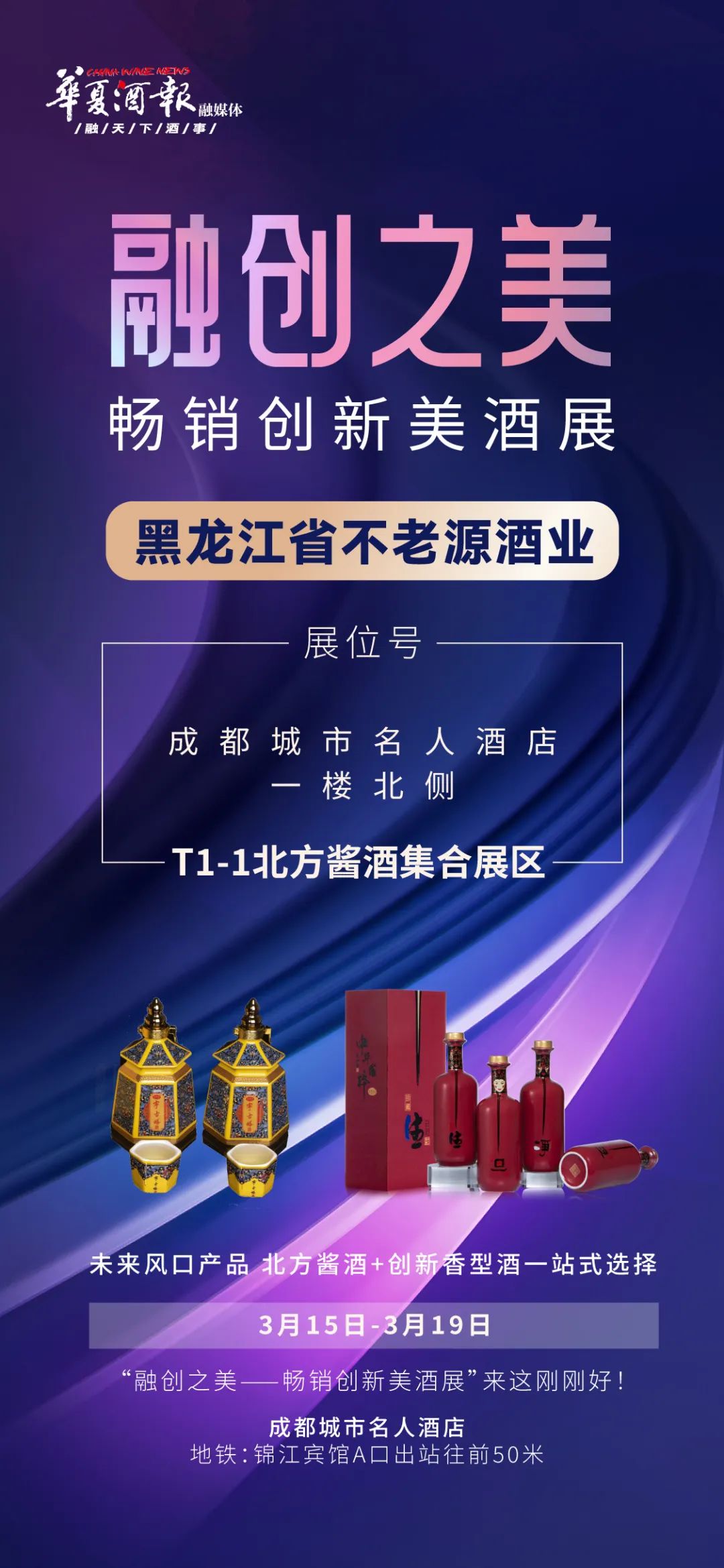 3月15日至19日,黑龍江省不老源酒業在成都城市名人酒店一樓北側“融創之美——暢銷創新美酒展”T1-1北方醬酒集合展區歡迎大家!