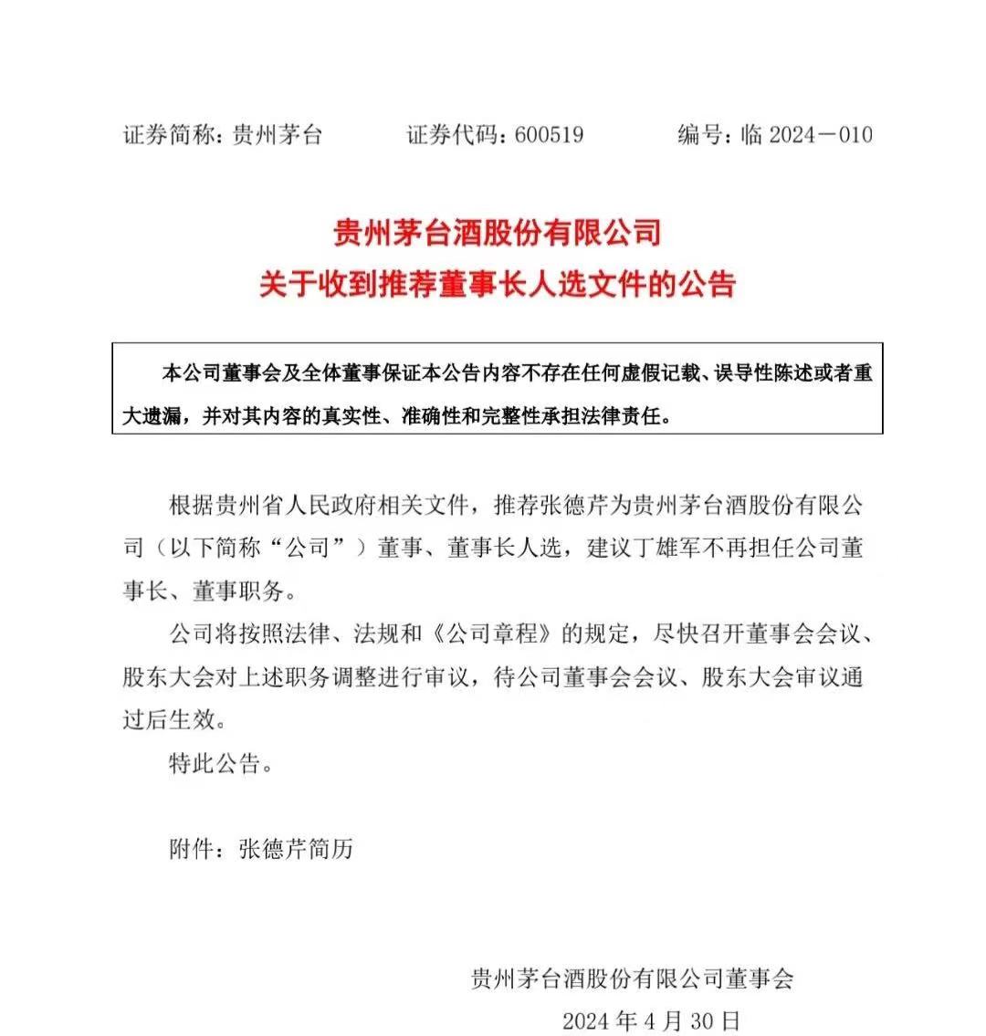 4月29日晚,貴州茅臺(600519)公告稱,根據貴州省人民政府相關文件,推薦張德芹為貴州茅臺酒股份有限公司董事、董事長人選,建議丁雄軍不再擔任公司董事長、董事職務。
